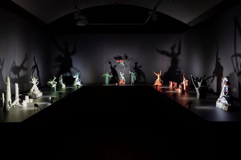 Pritemdytoje ekspozicijoje tarsi iš niekur išnyra grėsmingų vabzdžių armija, A. Šemberaitės surinkta iš 2019–2023 m. sukurtų ciklų ar jų fragmentų („Rem miego fazė“, „Mimikrija“, „Nemiga“). Gyvūnų pasirodymas baugina. Ekspozicija atgyja, atrodo, kad vabalai nerimastingai alsuoja, šiepia dantis, maskuojasi, sėlina prie žiūrovų. Jų nekoordinuoti judesiai ir aštrūs siluetai, metantys ant sienų keistus šešėlius, aitrūs raudonos ir žalios spalvos kūnai bei monotoniška melodija su skėrių čirpimu (autorė Migloko) sustiprina tvyrančią įtampą. Gyvūnų įvaizdžiais Agnė kalba apie žmogaus pažeidžiamumą ir gyvenimo įtampas, kviečia pažinti savo vidines baimes ir susigyventi su jomis. Toks požiūris turi pasaulio mene atsiradusio „gyvūninio posūkio“, t.y. žmogaus ir gyvūno santykių permąstymo, bruožų. Ne žmogus medžioja gyvūną, bet pats tampa jo auka. Parodos anotacijoje (autorė Kamilė Pirštelytė) kalbama apie Šemberaitės kūrybos daugiasluoksniškumą, kilusį iš asmeninės ir kolektyvinės patirties, kelionę žmogaus pasąmonės labirintais, Sigmundą Freudą ir Carlą Gustavą Jungą, archetipinių simbolių gausą keramikės kūryboje.